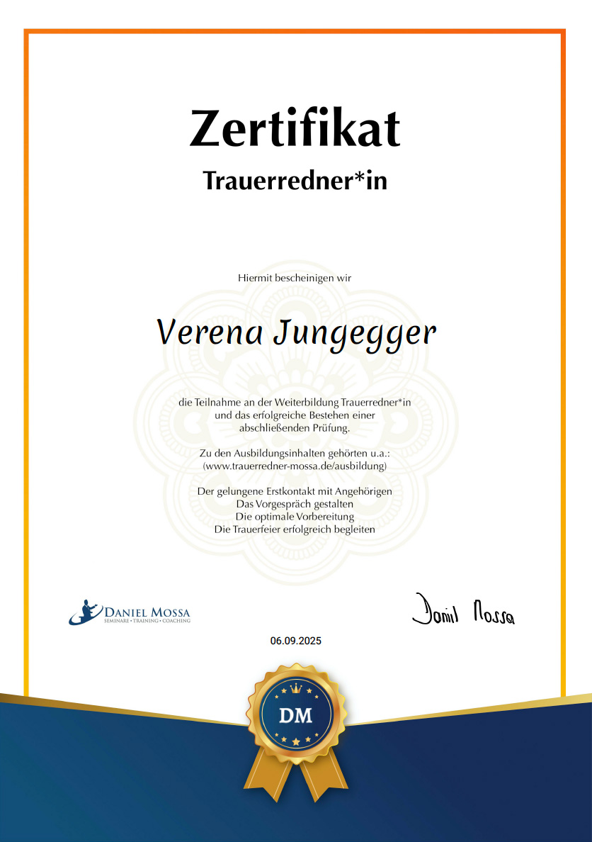 - Trauerredner: Ausbildung an der Mossa-Akademie